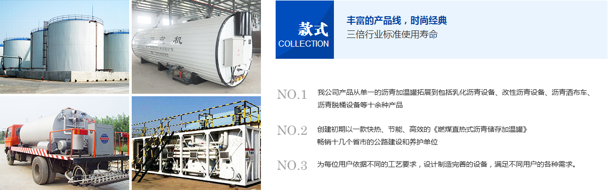 目前我公司产品从单一的沥青加温罐拓展到包括乳化沥青设备、改性沥青设备、沥青洒布车、沥青脱桶设备等十余种产品。